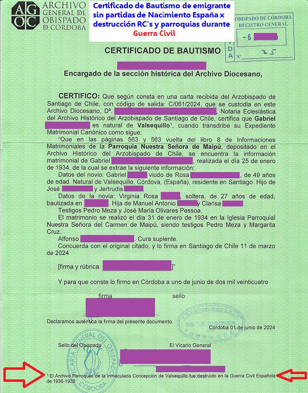 El reverendo J.L.A. me ratificó que el registro civil de Valsequillo en la provincia de Córdoba había sido destruido por un incendio durante la Guerra Civil en España…pero me comentó que era posible encontrar una solución si el emigrante se hubiera casado por la iglesia, es decir, por la vía de documentación canónica (cánones eclesiásticos).