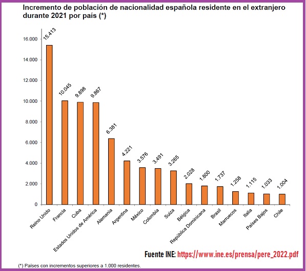 En términos absolutos, los mayores crecimientos de población española durante 2021 se registraron en Reino Unido (15.413 más), Francia (10.045) y Cuba (9.898).