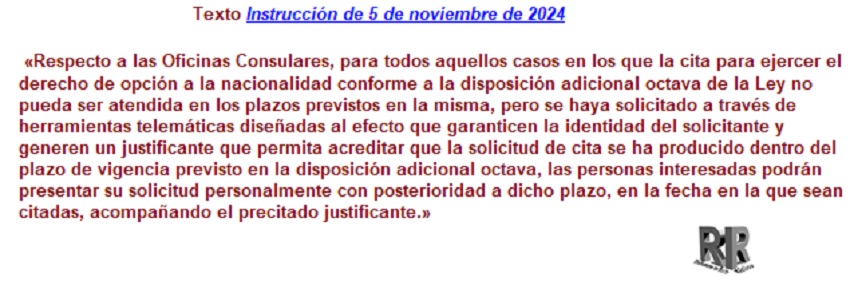 Instrucción de 5 de noviembre de 2024, de la Dirección General de Seguridad Jurídica y Fe Pública, por la que se modifica la Instrucción de 25 de octubre de 2022, sobre el derecho de opción a la nacionalidad española establecido en la disposición adicional octava de la Ley 20/2022, de 19 de octubre, de Memoria Democrática.