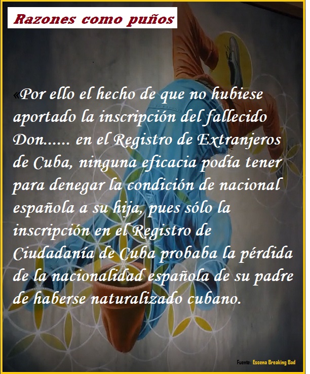 «Por ello el hecho de que no hubiese aportado la inscripción del fallecido Don…… en el Registro de Extranjeros de Cuba, ninguna eficacia podía tener para denegar la condición de nacional española a su hija, pues sólo la inscripción en el Registro de Ciudadanía de Cuba probaba la pérdida de la nacionalidad española de su padre de haberse naturalizado cubano.
